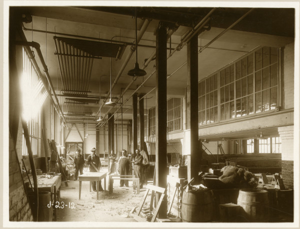 A photographic print showing a group of men making furniture inside a warehouse and.presumably taken near the Spirella factory, Niagara Falls, USA/America. Circa 1912