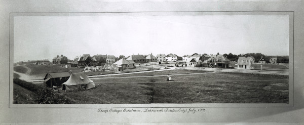 Negative reproduction of a black and white photograph showing Nevells Road exhibition site under construction entitled "Cheap Cottages Exhibition, Letchworth (Garden City) July, 1905."